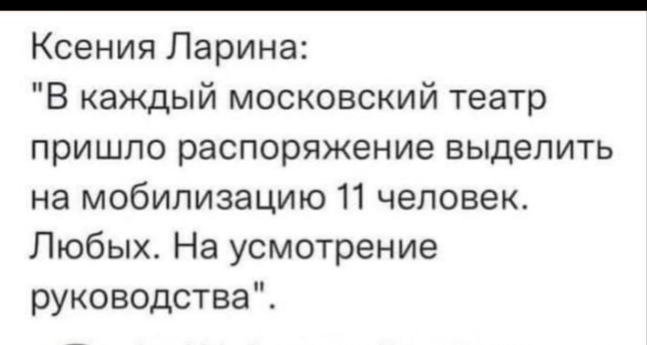 А что сейчас говорит эта же Ксения Ларина? Ой, а оказывается в каждый московский театр пришло распоряжение выделить на мобилизацию 11 человек. Да ты что, Ксюша!... Кто бы мог подумать!