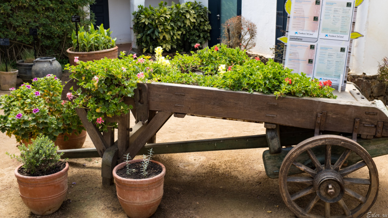 Такая зеленая тележка встречает посетителей перед кассой. (Кстати, для клиентов банка La Caixa вход в сад - бесплатный, достаточно только показать карточку этого банка.)