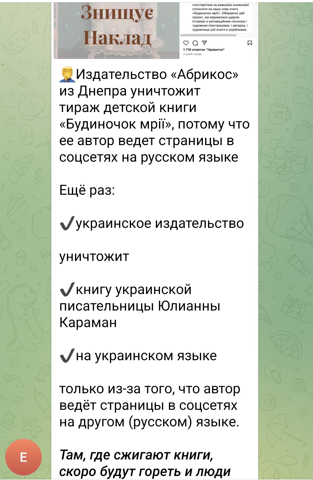 Итак, издательство в Днепре (!) уничтожает тираж книги на украинском языке (!), потому что автор пишет в соцсети на русском. В Днепре! Издательство идёт на убытки, потому что автор делает то, что делает огромная куча народу.
