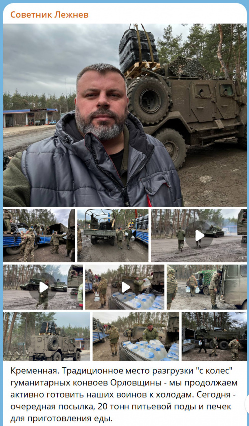 Есть такой советник губернатора Орловской области Сергей Лежнев. Он занимается сбором и доставкой гуманитарки на войну, ну и об этом активно пишет в своем ТГ, снабжая всякими фото- и видеоматериалами.