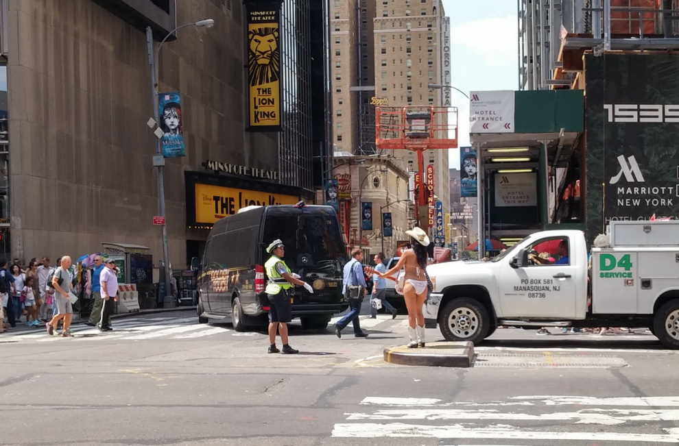 Вместо знаменитого "Голого ковбоя" - девушка в купальнике и с целлюлитом. И с гитарой.