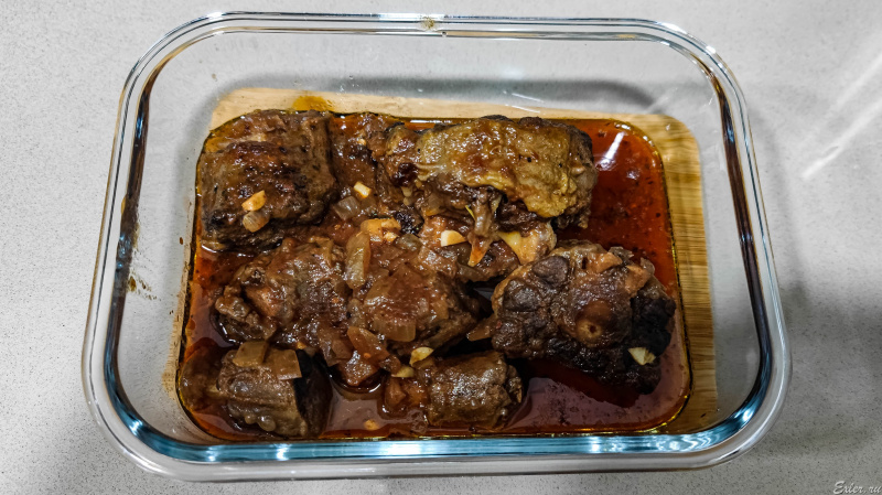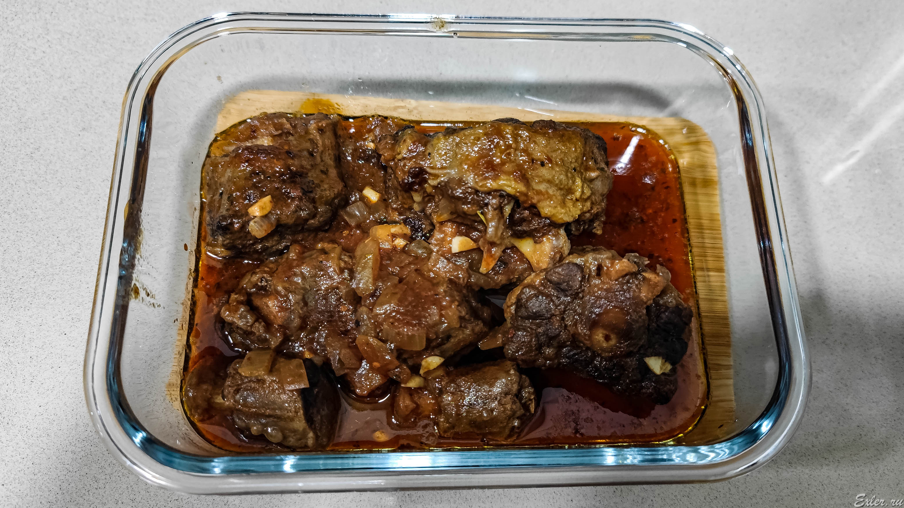 Хвост поставил на тушение на 3 часа на 95 градусов, потом достал и попробовал - снова поставил еще на 2 часа. Ну и в итоге получил то что нужно. Блюдо - нежнейшее и вкуснейшее, как в ресторане.