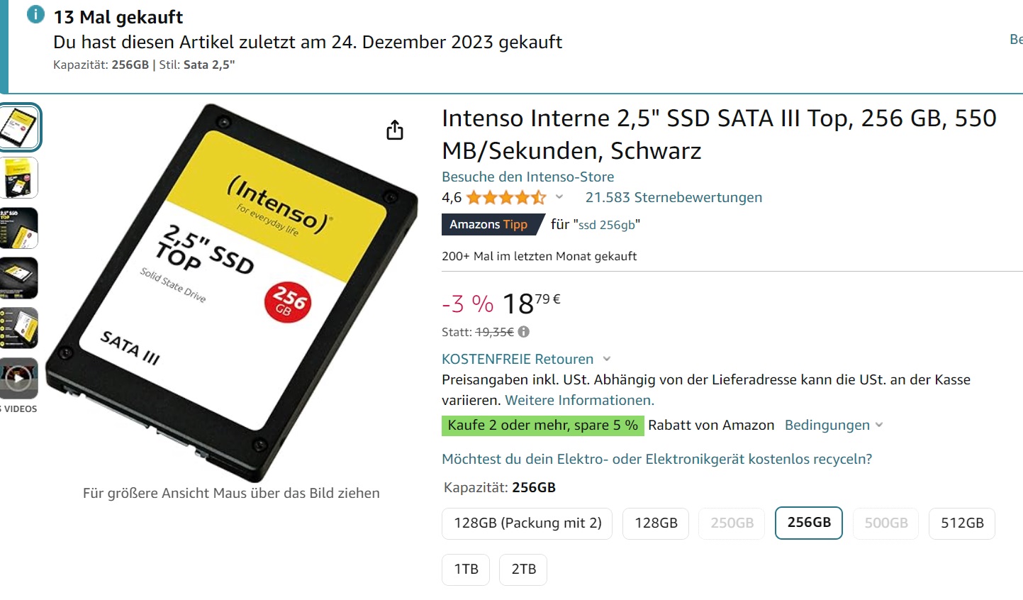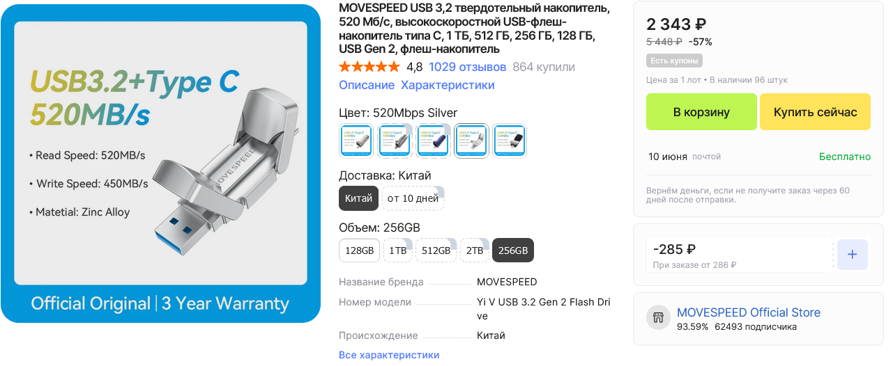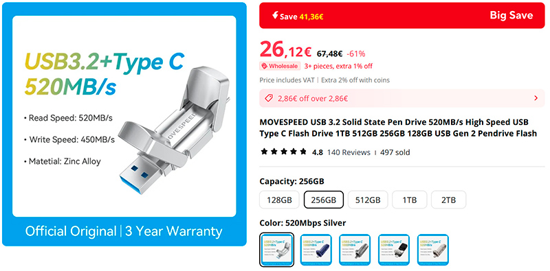 Мне кто-то хвалил флешки от Movespeed - говорили, что они качественные и быстрые. Ну и заказал на пробу вариант на 256 ГБ, благо стоит это всего €26, а 256 ГБ для моих задач хватит. Кстати, терабайт у них стоит €76 - вполне нормальная цена, на мой взгляд.