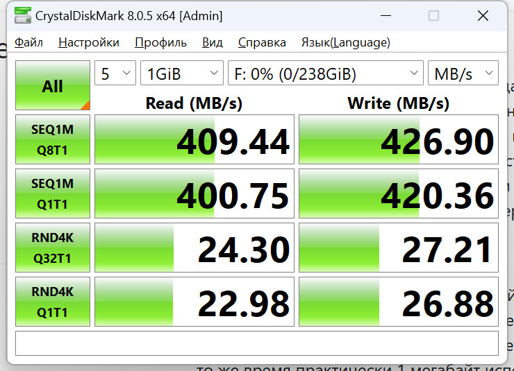 Тестирую скорости. Воткнул в USB 3.0 своего ПК. Ну что - в общем, нормально, примерно так и обещали. В USB-C ПК и ноутбука - примерно то же самое по скоростям.