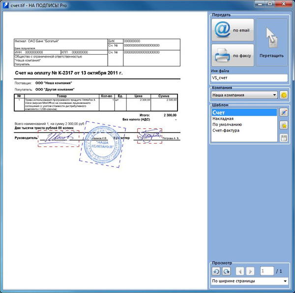 В любой привычной вам программе (MS Word, MS Excel, 1C) подготовьте счёт и напечатайте его... но не на вашем принтере, а на виртуальном принтере VentaSign, который появится в списке принтеров на вашем компьютере после установки программы. В результате печати откроется окно программы "На подпись!™" с графическим изображением счета. Но это ещё не всё. Программа сама поймёт, что напечатан счёт и расставит по местам первую и вторую подписи, печать компании. А при необходимости и какой-нибудь рисунок, например, фирменный логотип. Это будет выглядеть примерно так.