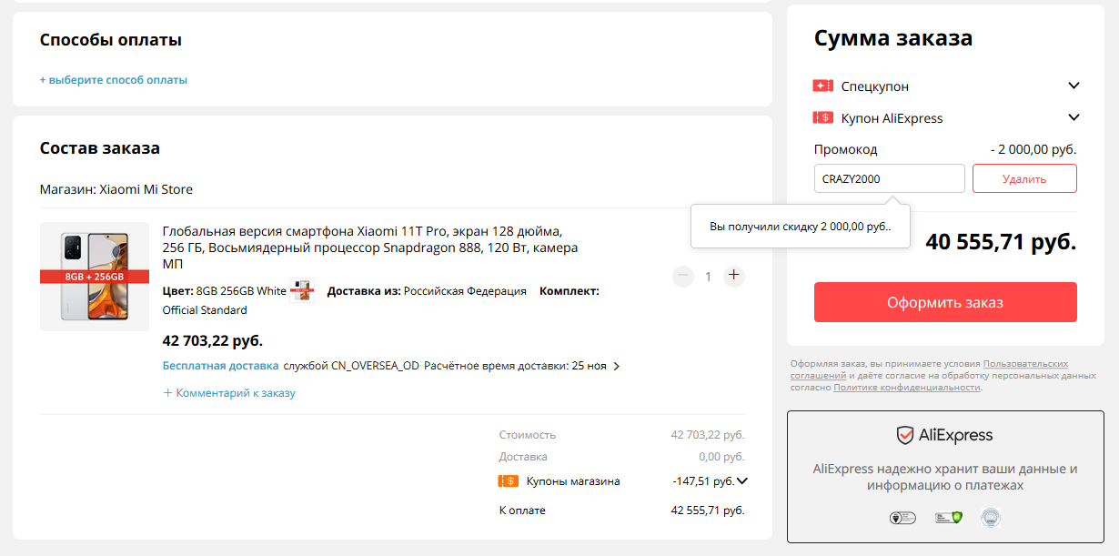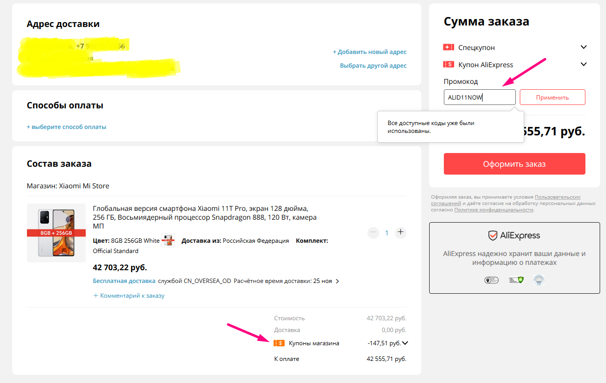 Или применить другой промокод (не магазина), на примере этого же телефона Xiaomi 11T Pro