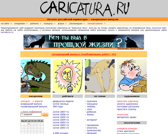 Сайту Caricatura.ru исполнилось 8 лет! (Это не шутка, он действительно был открыт 1 апреля.) Похоже, что это самая большая коллекция авторских карикатур в мире (причем, заметьте, не ворованных - работы присылают сами авторы) - 18000 авторских карикатур примерно 1000 художников.