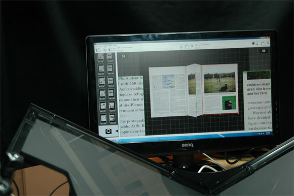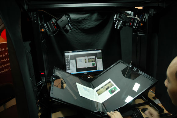 Вся суть - в использовании для снятия изображений двух фотоаппаратов. При этом скорость получается очень высокая. Кладется разворот, сканер автоматически делает снимки страниц и компонует их в специальной программе. Там же можно делать распознавание, чтобы получать готовый текст.