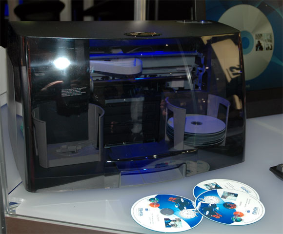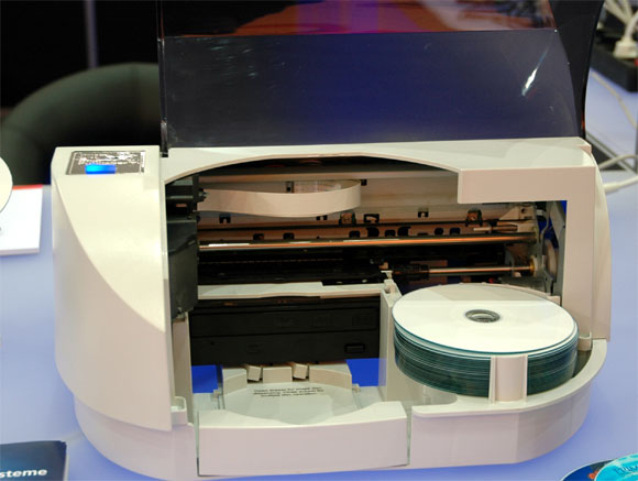 Любопытные принтеры для записи дисков и печати обложки на них. Загружается целая пачка, пишется, печатается.
