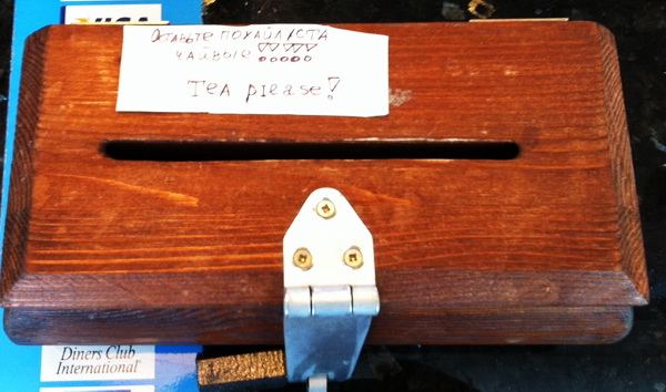 "Чайвые" - это уже пять баллов! Но представляю, как удивляются иностранцы, которые приходят купить что-то - например, чайку, - а у них на кассе требуют чай. Я этим работникам бутерброда и сосисок хотел было сказать, что чаевые на английском - это tips, но потом вспомнил, что умников никто не любит, так что не стал ничего говорить. Кроме того, надпись присобачена скотчем навечно, так что навечно она там и останется. Аминь.