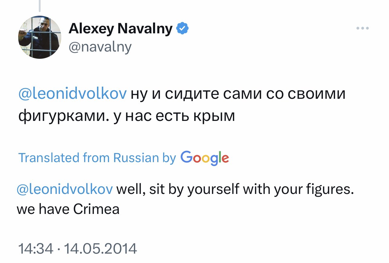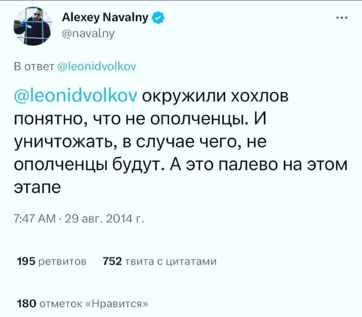 Да, а фраза про Навального была сказана каким-то украинским "патриотом", мол, Навальный в преддверии войны добровольно сел, подсуетился, чтобы отсидеться.