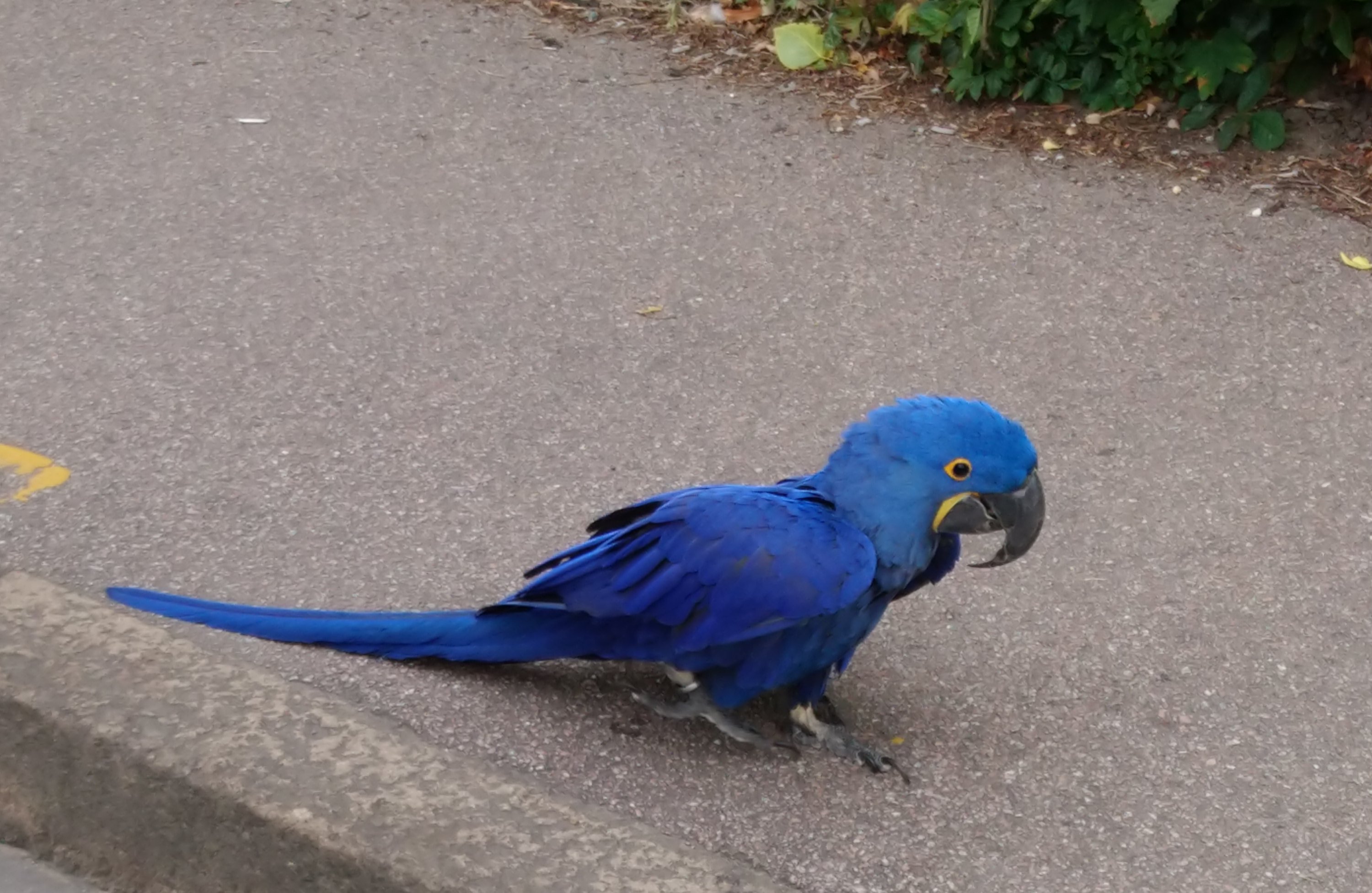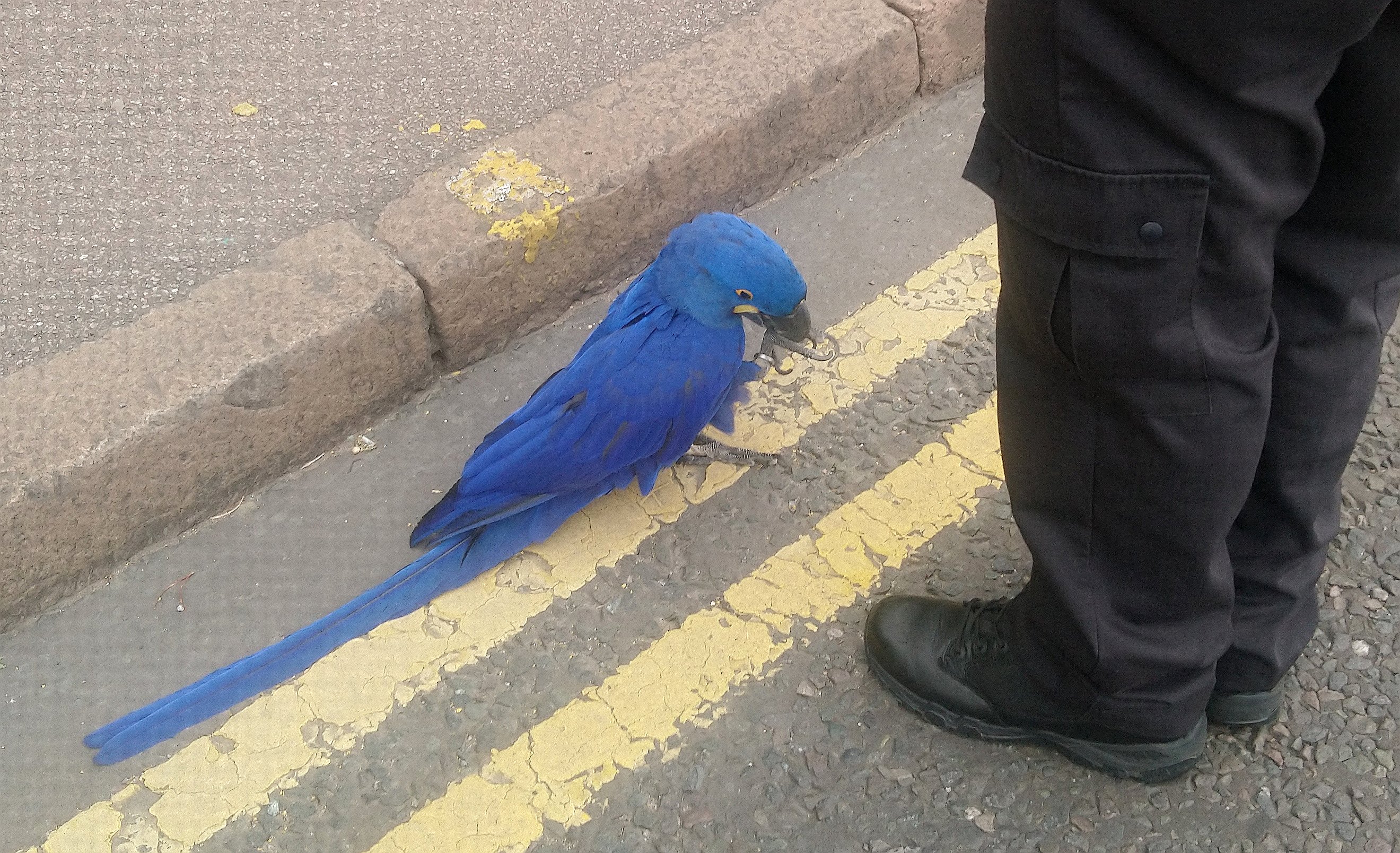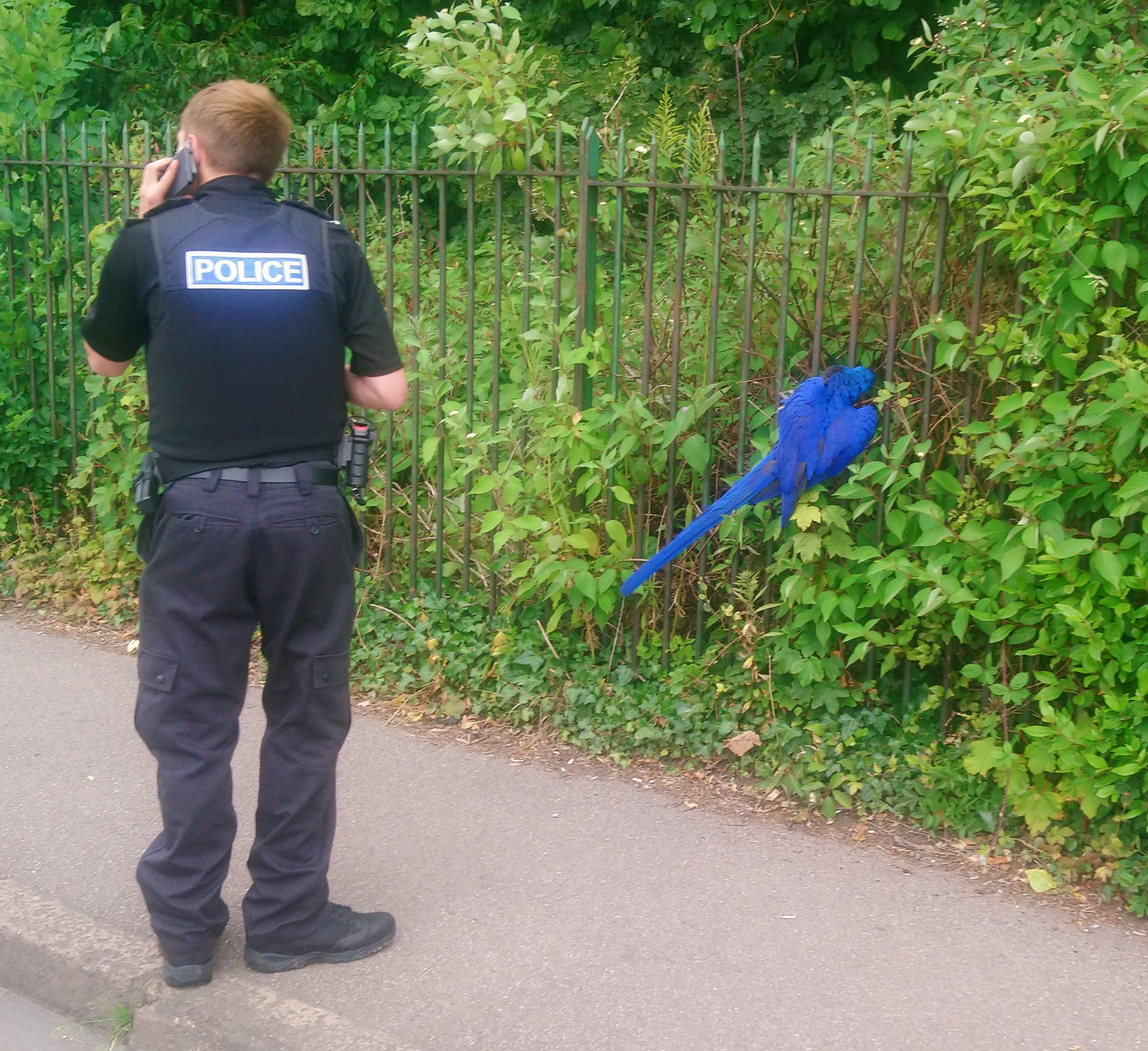 Ехали седня из сделай сама в наших английских Люберцах, и увидели на обочине полицейскую машину и двух копов, о чем-то базарящих по рации. Проехали мимо, и поняли, что надо немедленно парковаться и идти снимать. Копы выписывали протокол про голубого попугая (ара?), паралелльно спрашивая по рации, че с ним делать. Попугай сидел на ограде, потом с нее слез, и проковылял к копам. Я им посоветовал от его клюва держаться подальше.