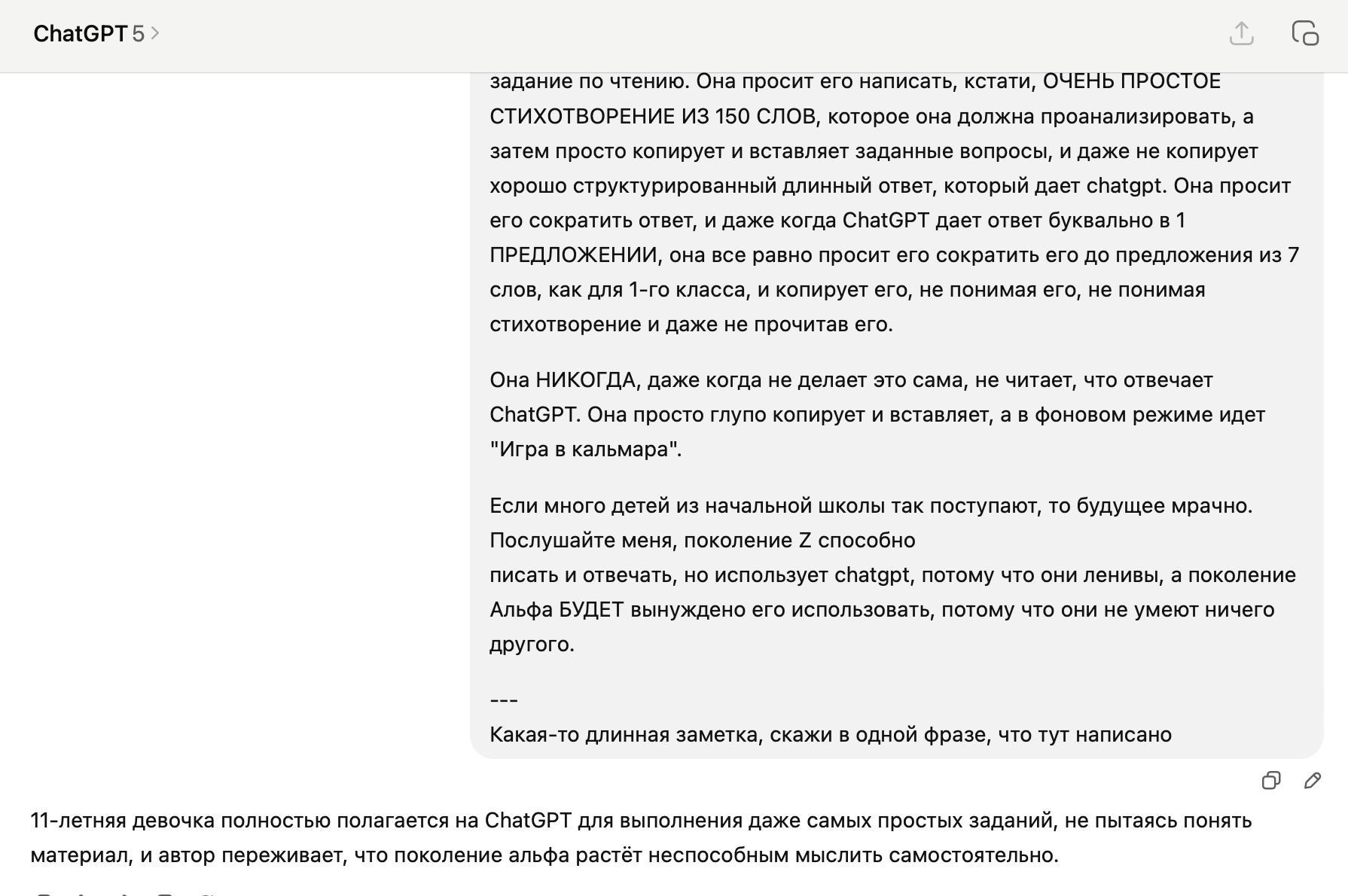 У меня дочь в 7 классе. Им задали какое-то аналитическое задание. Дочь сидит пишет сама, сосед просто загрузил чатжпт и потом говорит дочери: "ты только полстранички написала, а у меня уже всё готово", но дочь понимает ущербность такого подхода, продолжает делать сама.