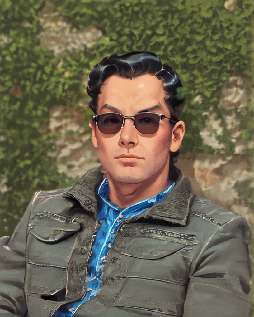 Имхо, результат так себе. Стиль художника воспроизведён хотя и узнаваемо, но довольно поверхностно: скорее, нечто "по мотивам и на тему" (с оригинальными работами не спутаешь). Главный минус в том, что деталям куртки уделено больше внимания, чем деталям внешности изображаемого джентльмена. Это безусловно, некий брюнет в очках, но это не Алекс Экслер.