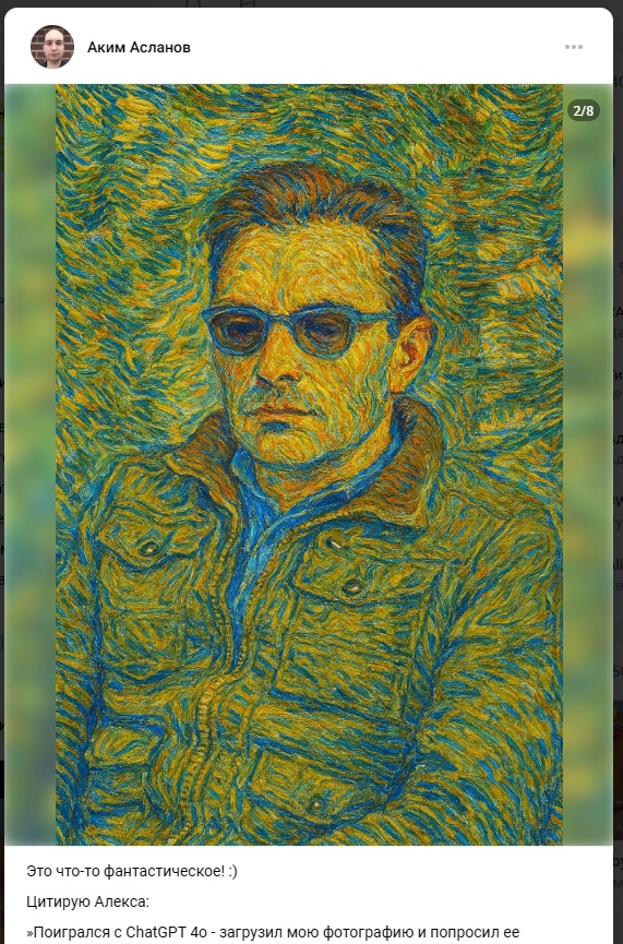 Поигрался с ChatGPT 4o - загрузил мою фотографию и попросил ее стилизовать под разных художников