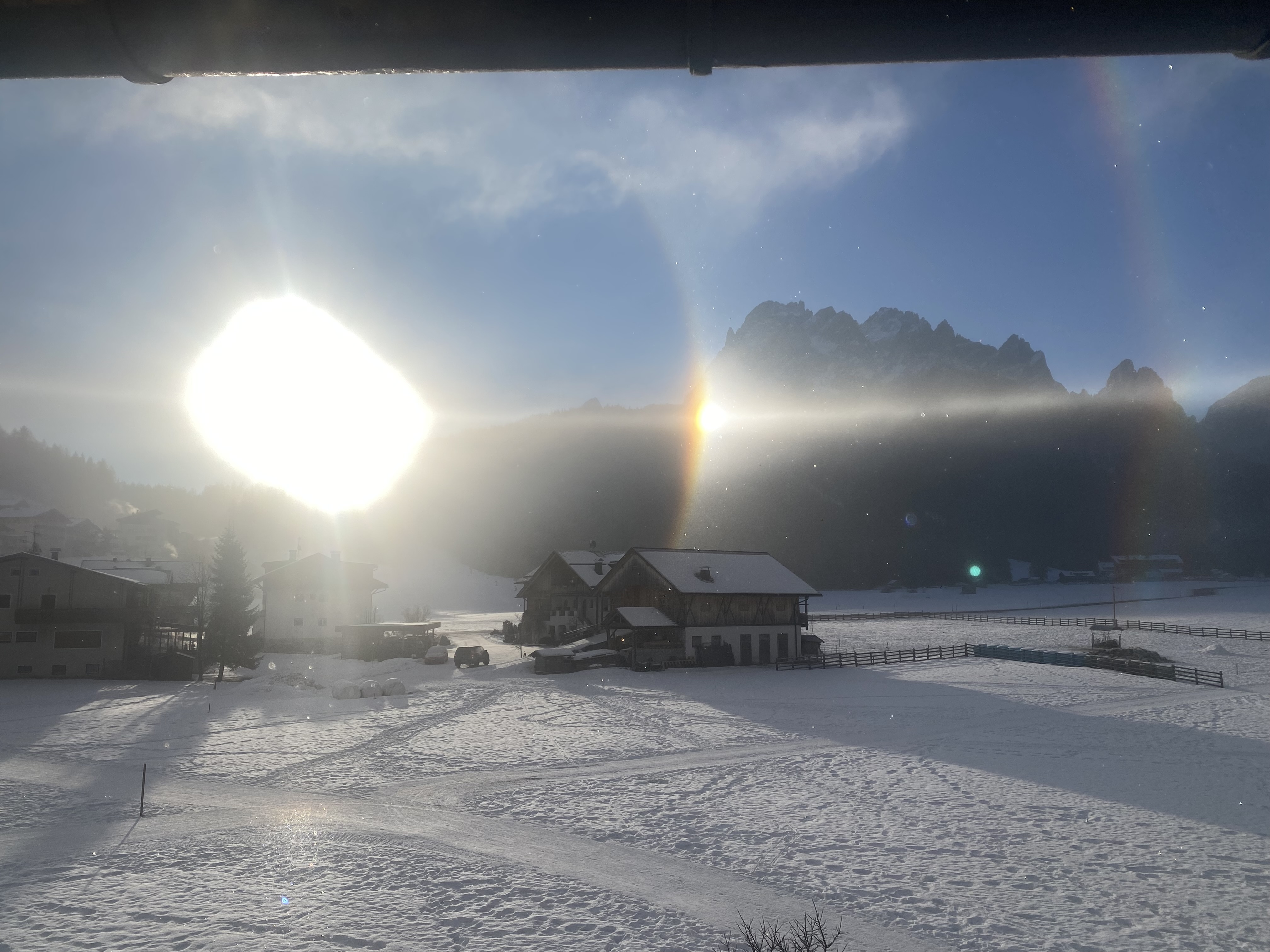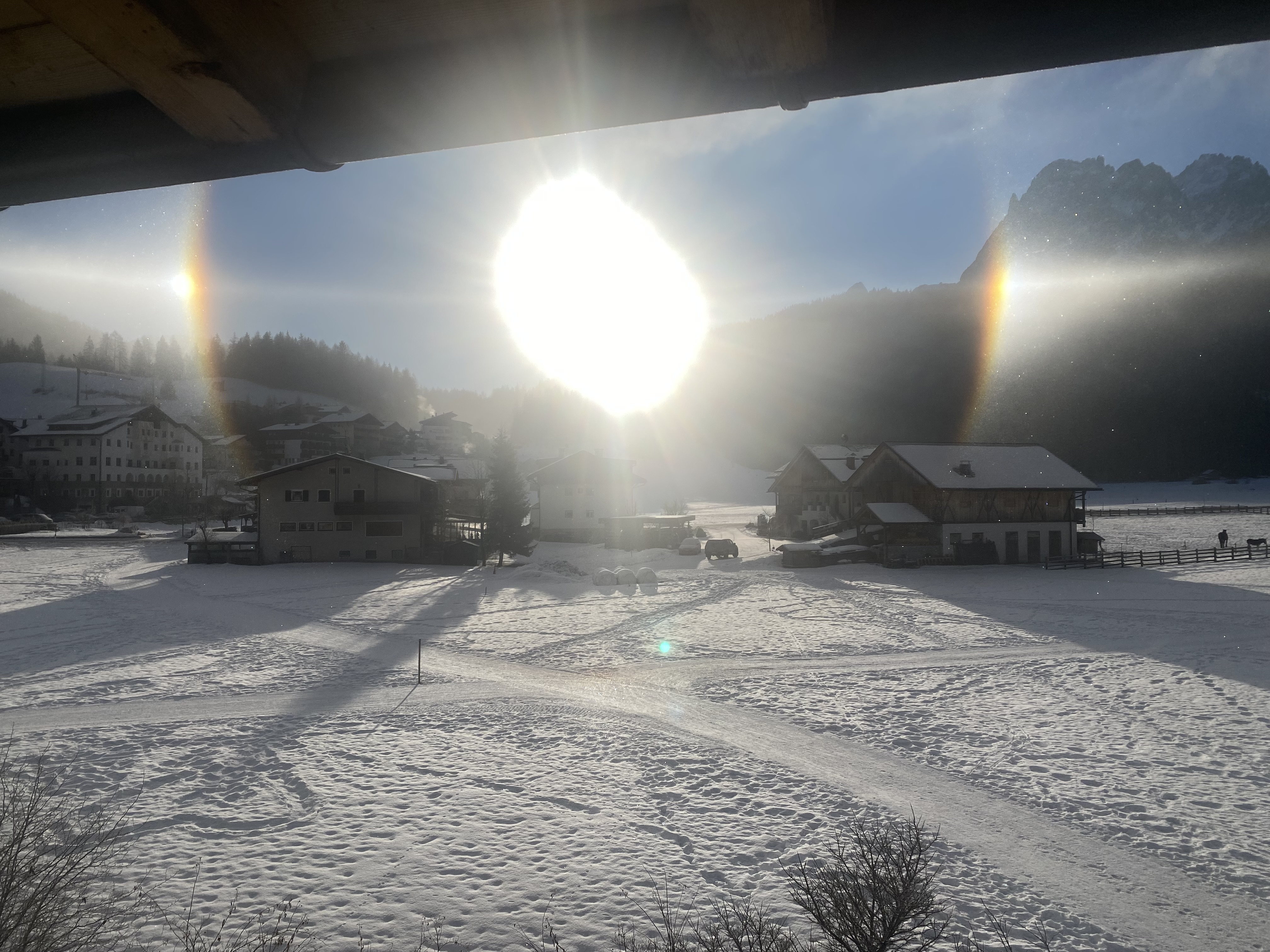 Раз в комментах много физики, то добавлю фото, снятое мом другом вчера утром в итальянских Альпах вблизи границы с Австрией. Это явление называется Parhelion и было объяснено Эдмом Мариоттом еще в 17 веке как преломление в кристалликах льда. Вокруг Солнца видно радужное гало (circumscribed halo, гало 22°), вокруг него гало в 46°. Есть горизонтальная полоса (Parhelic circle), вертикальная. На пересечении внутреннего гало с Parhelic circle расположены два Sun dogs. Гало в 46° можно увидеть очень редко.