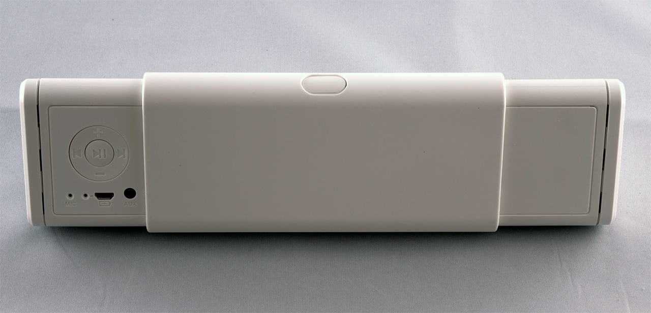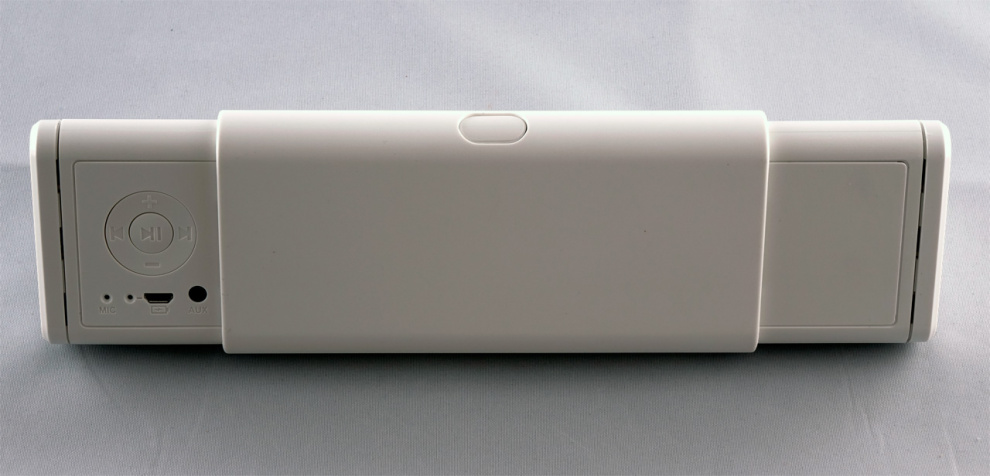 На задней крышке - клавиши управления, микрофон (колонку можно использовать как беспроводную гарнитуру смартфона), microUSB для зарядки и аудиовход для случаев, когда не хочется использовать беспроводное подключение.