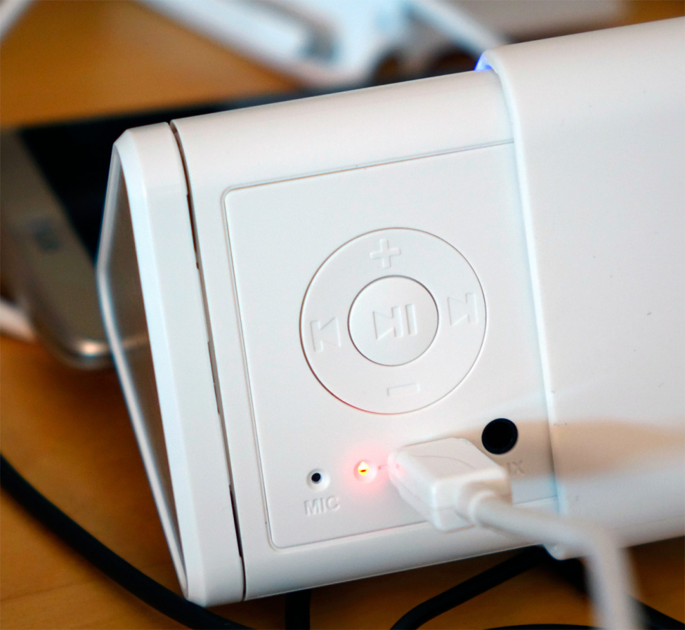 Уровень заряда колонка не показывает, но когда заряжается - светодиод горит желтым, а когда полностью зарядится - цвет меняется на синий. Производитель утверждает, что полной зарядки хватает на 10 часов - не врут: на тесте колонка у меня проработала даже немного больше - 10 часов 15 минут. Впрочем, она играла не на полной громкости.