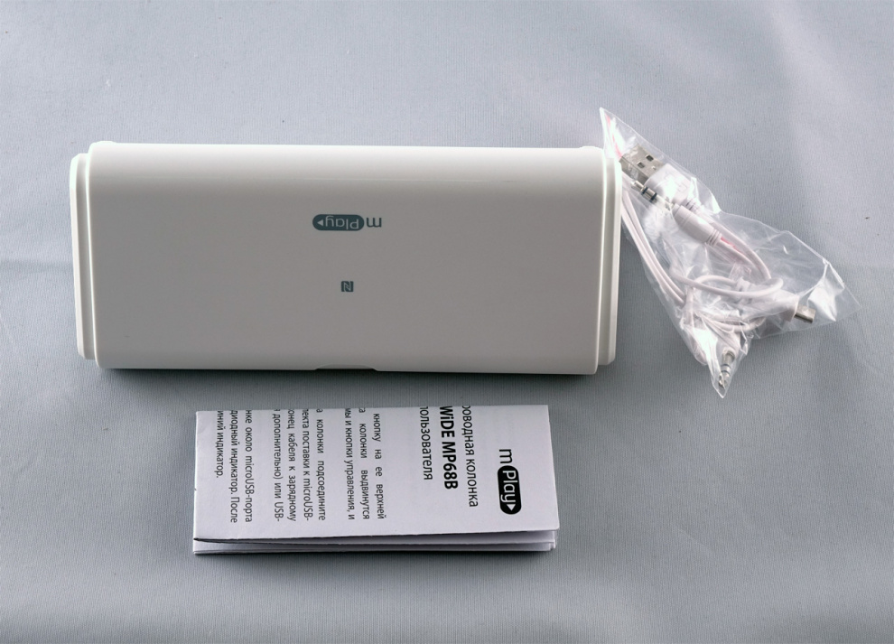 Комплект простой: колонка, кабель USB-microUSB, аудиокабель и инструкция.