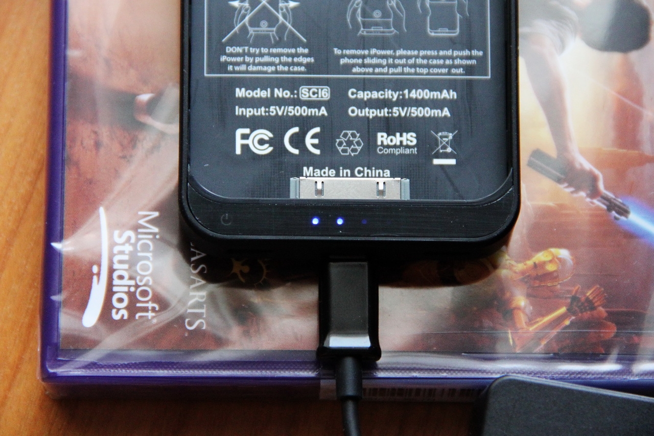 Комплектация - чехол-зарядка, кабель USB-microUSB, крышки-насадки для iPhone 4 и iPhone 4S, тряпочка для нюханья паров бензина.
