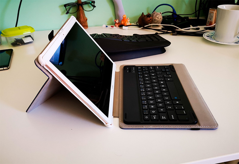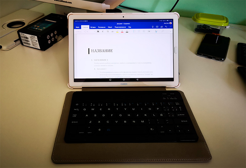 Можно, конечно, ноутбук с собой таскать. Но это как-то слишком громоздко. Решил попробовать взять для моего планшета Huawei MediaPad M5 10" чехол с беспроводной клавиатурой. Поискал на Amazon. Есть несколько производителей, но все выглядит совершенно одинаково. Заказал, приехало.