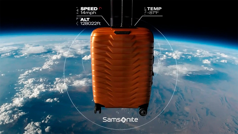 Так вот, компания Samsonite выпустила новую модель Samsonite Proxis Global Carry-on Spinner (стоимость порядка $425), и они ее с помощью стратосферного шара отправили на высоту в 40 километров, где температура составляла -65°C, и откуда чемодан сбросили: он летел со скоростью свободного падения (в ролике видно, что его скорость составляет где-то 140-150 км/ч), и где-то в километре от Земли раскрылся парашют, после чего чемодан благополучно приземлился на гору в Лас-Вегасе.