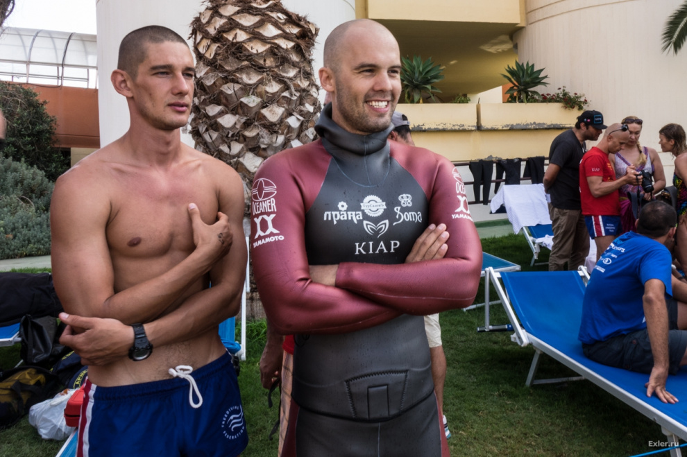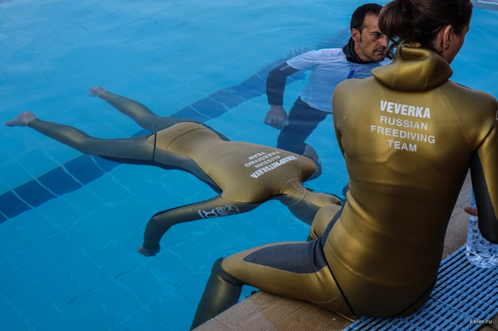 Марина Казанкова перед стартом. Ее напарник - спортивный врач команды Евгений Бутов. Он же является одним из ведущих инструкторов Федерации Фридайвинга России.