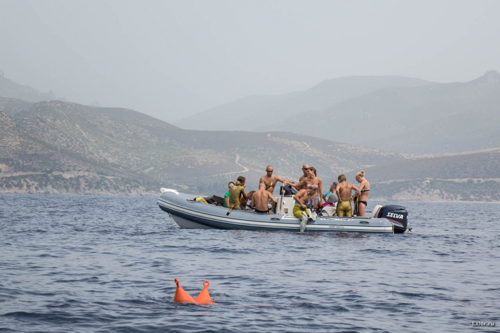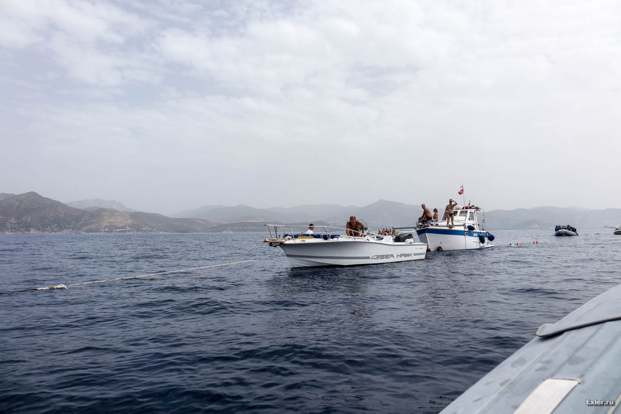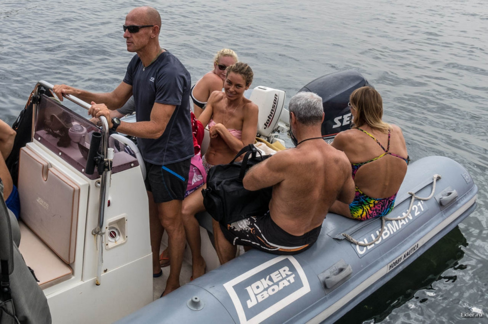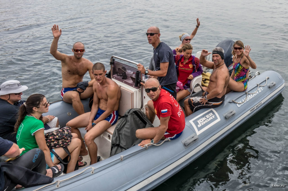 Мы с фотографом команды Александром Акивисом и судьями в теле сели во вторую лодку - и отправились на место погружений.