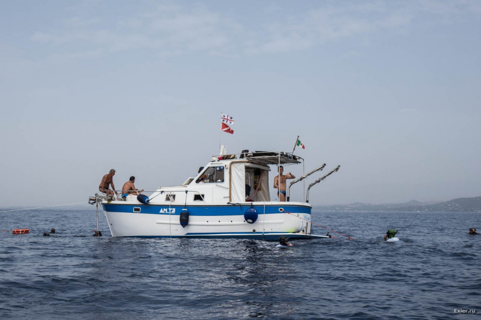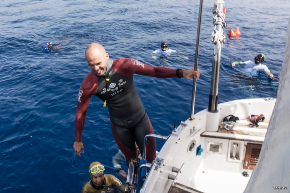 Алексей Молчанов уже отнырял - он погружался со второго катерка. Взял разминочные 90 метров (это у него такие разминочные) - завтра, на соревнованиях, пойдет аж на 120. (Напоминаю, что у него мировой рекорд - 128 метров.)