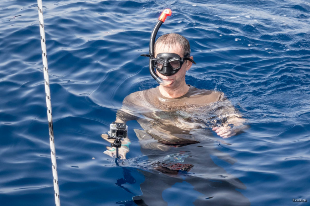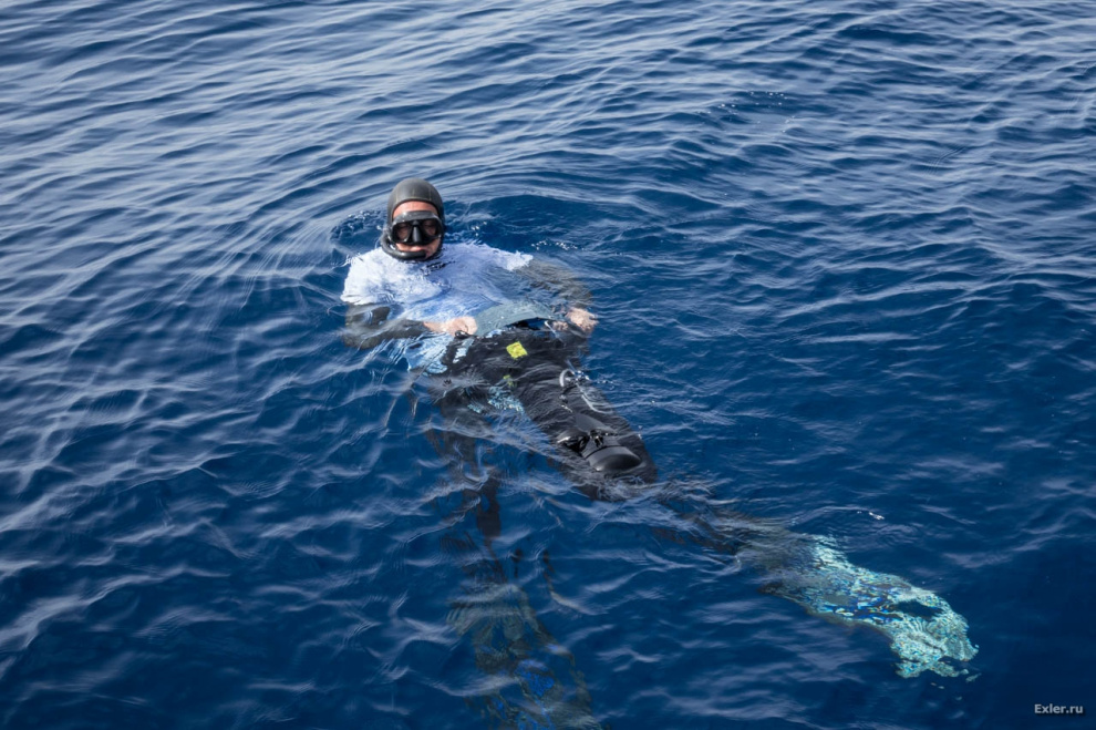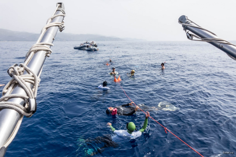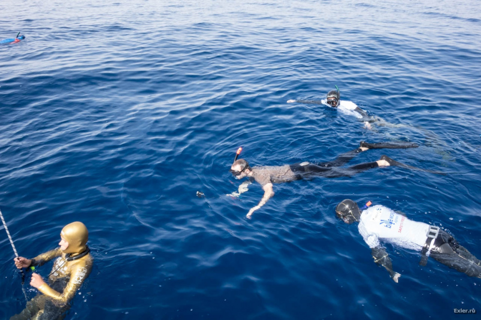 А это те самые страхующие. Непосредственно страхующих - трое: двое с масками-трубками, один - со специальным устройством под названием скутер, которое позволяет ему быстро опускаться на приличную глубину.