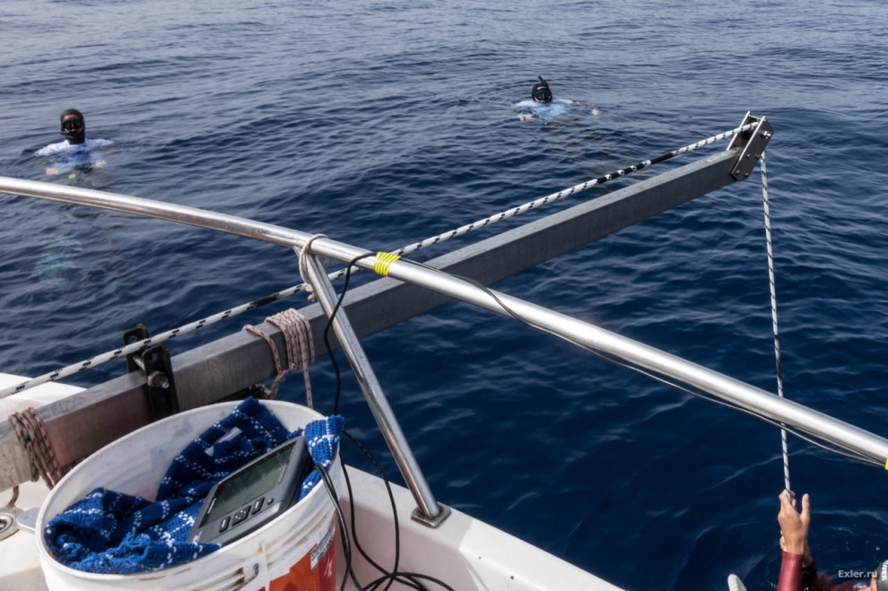 Фридайверы надевают костюмы и снаряжение (грузы - специальные ошейники или пояса с вшитыми свинцовыми бляшками) и готовятся отправляться к разминочным буйкам. Грузы надеваются для облегчения старта погружения - чтобы меньше сил тратить, они еще пригодятся.