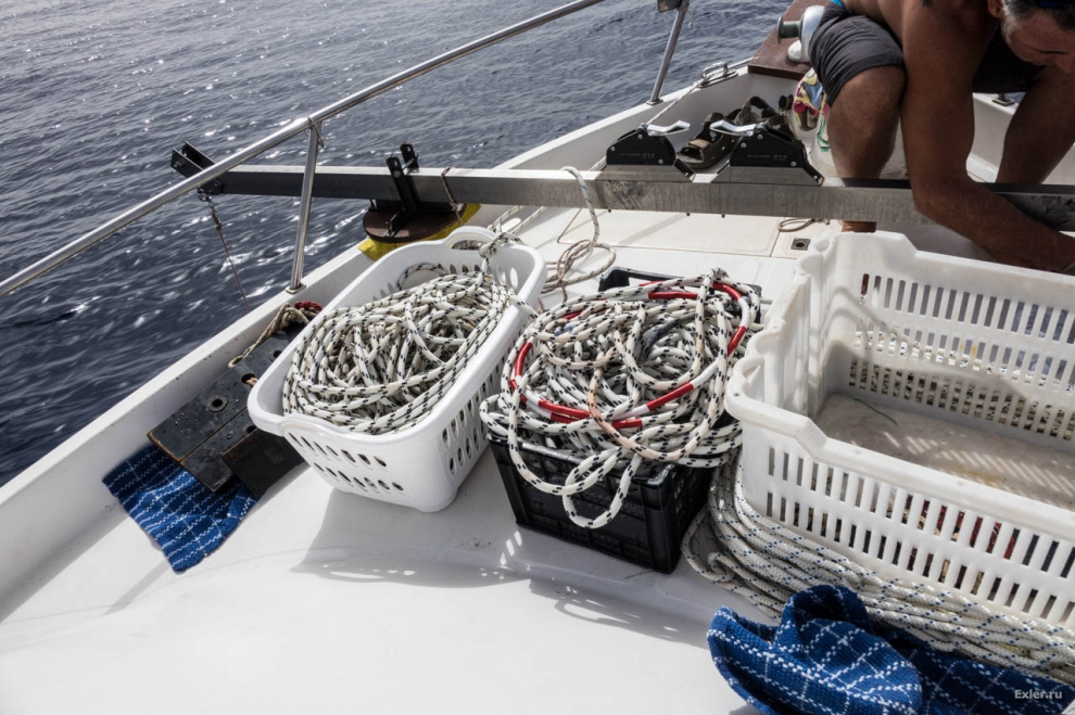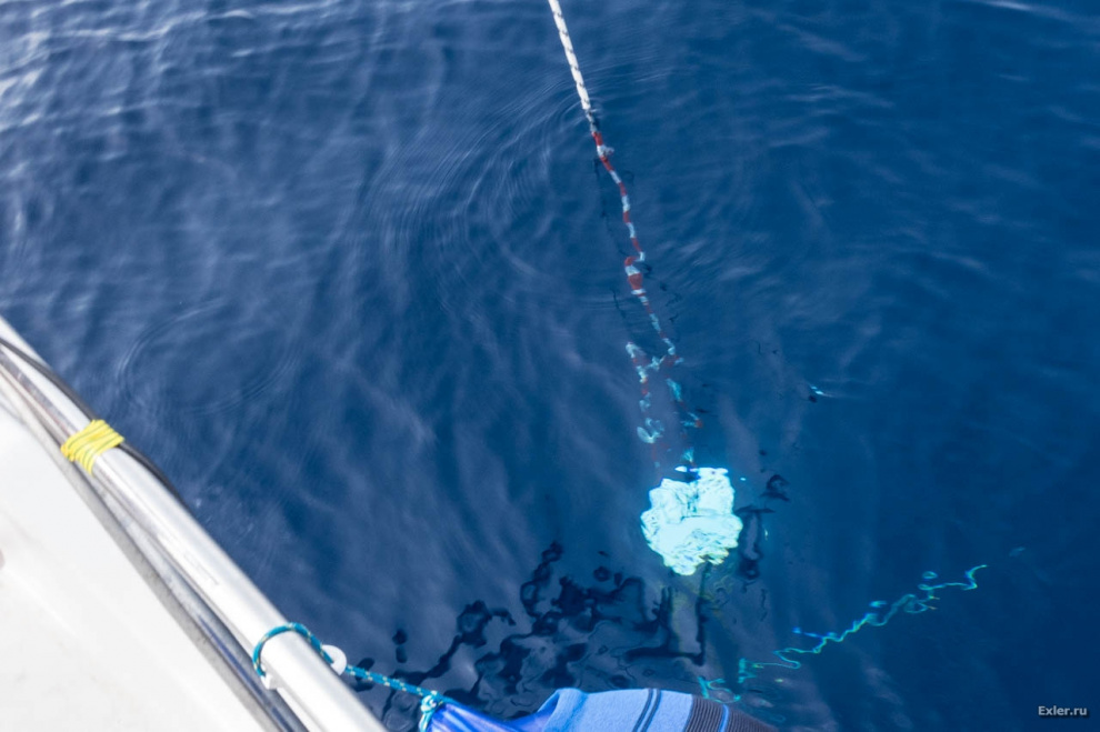 Вот тут (это я уже снимаю с катера) хорошо видно, как идет трос с разминочными буйками.