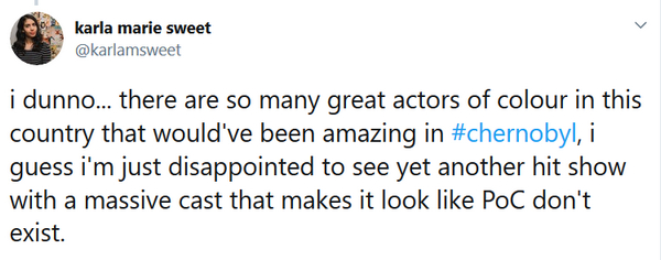 Девушка страшно возмущена тем, что в прекрасном сериале "Чернобыль" (американском, конечно же) нет цветных актеров. Позор HBO, позор! Я уж молчу о том, что геев там тоже нет. И трансвеститов. Думаю, надо сразу студии бойкот объявлять. Что за дела-то вообще?
