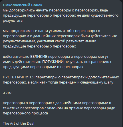 Стало ясно, что любые переговоры, на любом уровне абсолютно бессмысленны и являются пустой тратой времени. По крайней мере, при сегодняшнем наборе игроков в "мирное урегулирование".