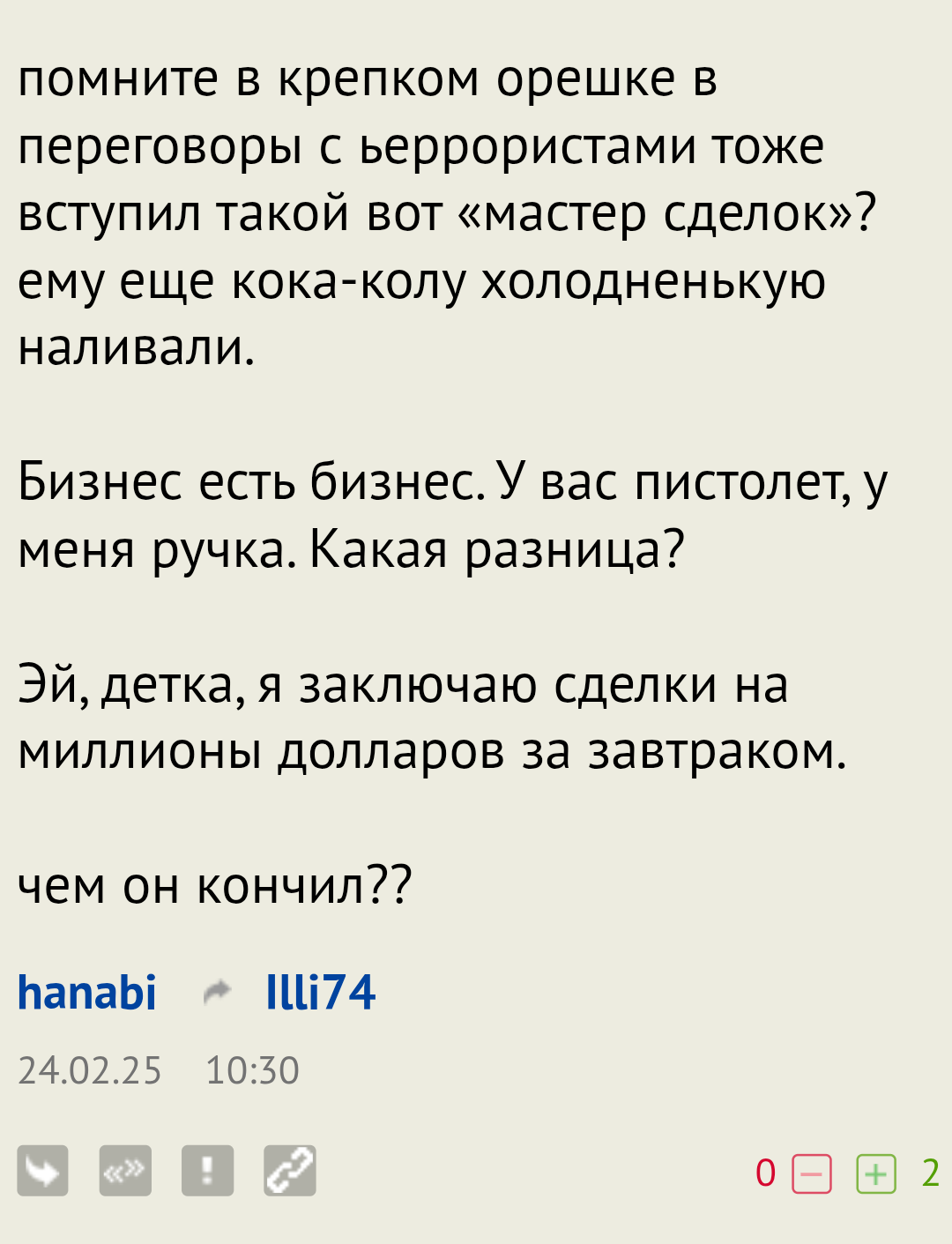 Мы прекрасно знали, что широко анонсированный Трампом разговор с Путиным не приведет ни к чему. О чем они там болтали два часа, да так, что, по словам этого хряка Ушакова, никто из них не хотел класть трубку? Да о чем угодно. О турнире по гольфу, о том, что Трамп - великий (Путин его так назвал два раза), что Трамп - гений (Путин его так назвал три раза). Также Путин пообещал Трампу, что он немедленно начнет переговоры с Украиной, да, собственно, он же уже начал - Мудинский в Стамбуле озвучил требования. Украине всего-то нужно на это все согласиться, и тогда война закончится. Путин - молодец, сказал Трамп, Путин имеет свое видение. Нужно с ним начать широкомасштабную торговлю.