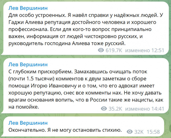 В ТГ соратника Стрелкова z-патриота Льва Вершинина этот Вершинин опубликовал пост о сборе помощи жене Стрелкова на всякие судебные издержки. Там было сообщено, что адвокатом Стрелкова стал дагестанец Гаджи Алиев. Ну и в комментах Вершинина ожидаемо началось: большие патриоты и настоящие русские националисты были страшно возмущены тем, что "ихнего" во все стороны русского Гиркина будет вдруг защищать известно кто (термины я приводить не буду, вы сами догадаетесь, какие слова там употреблялись).