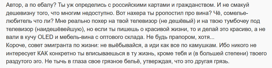 Пришло тут одно чудо природы в комменты - научить меня жизни. По-моему, очень мило, я прям тронут. Не то чтобы гениально, но мило, да. И заход такой энергичный, и "тумбочеу" мою обидели, и посоветовали жизнь красиво, но при этом не быть прапором. Прэлэстно! "Эмигранты по жизни" - они бывают очень забавные.