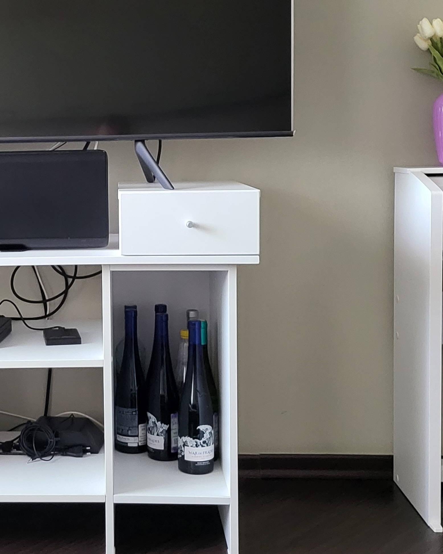 А я вот посмотрел на свою тумбу и все понял. У меня телевизор 85-й надо было куда-то поставить, заказал тумбу. Наидешевейшую, без дверок. А в тумбу оказалось ставить нечего - и комп и плеер теперь крохотные... Решил ставить туда вино. Все в общем-то по необходимости вышло, хвастаться нечем...