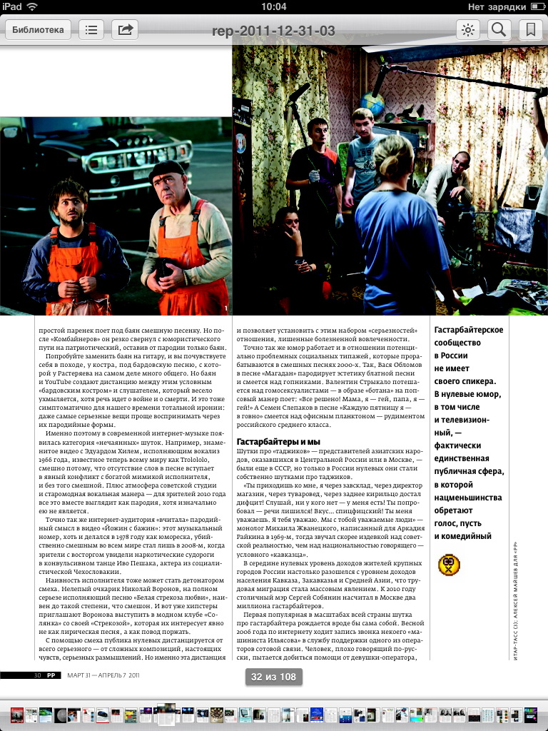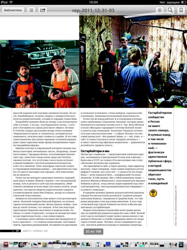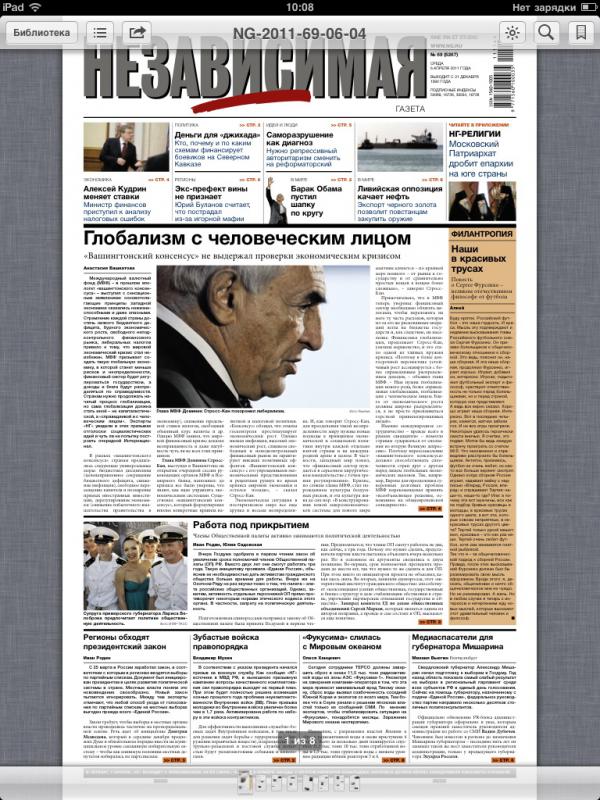 Сейчас стали появляться всякие сервисы, которые предлагают электронную подписку на периодические издания - чтобы получать их в PDF. Ссылки на эти сервисы пока не даю - там пока все очень криво и каталог бедный. Я купил несколько изданий, чтобы посмотреть, реально ли это все читать на iPad - только так это имеет какой-то смысл.