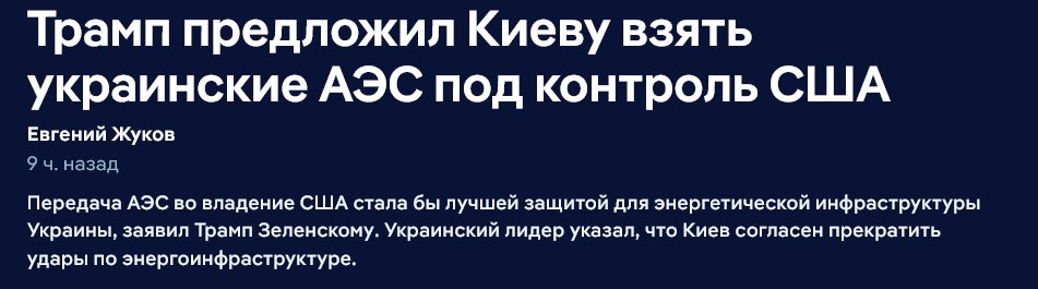 Вот реально важные новости:Трамп предложил Киеву взять украинские АЭС под контроль США. Передача АЭС во владение США стала бы лучшей защитой для энергетической инфраструктуры Украины, заявил Трамп Зеленскому.