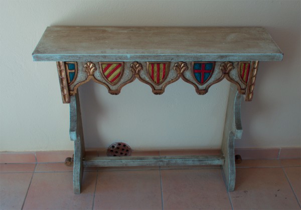 Да подставка это для швейной машинки... У моей бабушки-портнихи был такой столик для ручной швейной машины. Без гербов, конечно, - зачем старенькой еврейке из Харькова гербы испанских грандов?