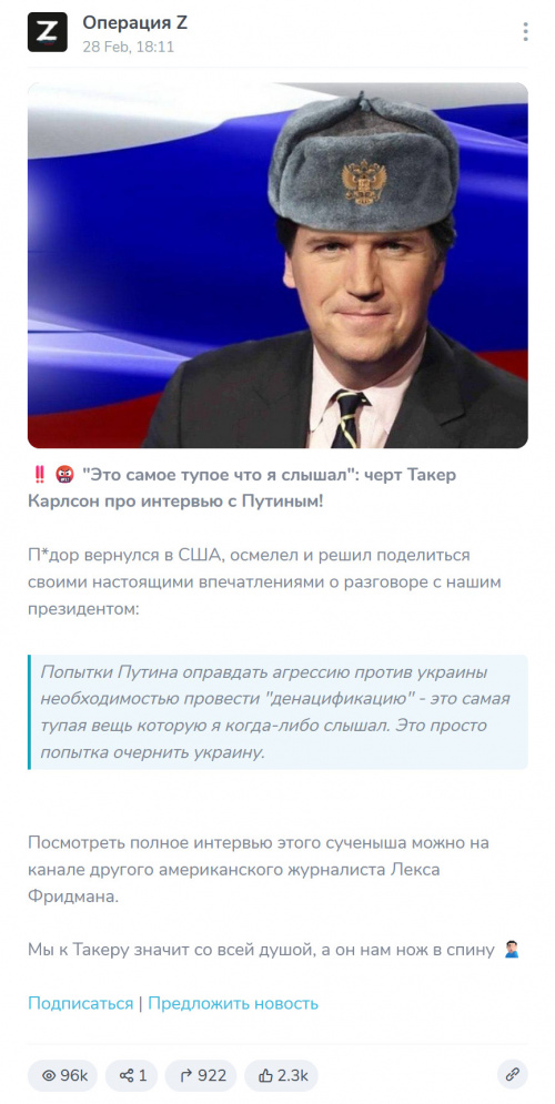При этом они дали ссылку на это интервью, что, конечно, совершенно напрасно сделали, так как Карлсон там за три часа наговорил немало интересного, и некоторые другие издания обратили внимание на слова Карлсона о так называемой "денацификации Украины", о которой любит талдычить друг Карлсона Вова Путин и его пропагандисты.