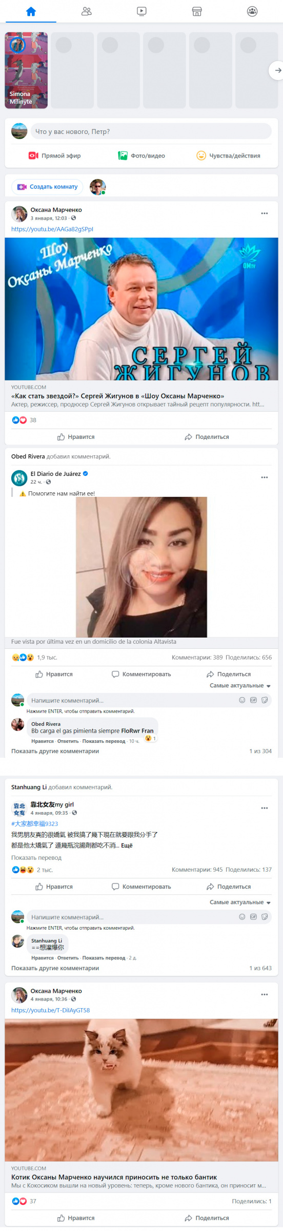 Интересный эксперимент. Есть у меня тестовый аккаунт в Facebook, который я заводил, чтобы посмотреть, как со стороны показываются записи моего основного аккаунта. Подписка у этого аккаунта - одна-единственная, на мою страницу. Я про него забыл совсем, а недавно зашел проверить - так там в ленте кроме рекламы и кроме моих записей (далеко не всех) - еще куча всякого барахла от совершенно непонятных людей, которые ни в друзьях, ни в подписках, конечно же, не фигурируют никак. Вот кусок ленты (там на самом деле раза в три больше, я часть уже удалил), откуда вычищены мои посты и реклама.