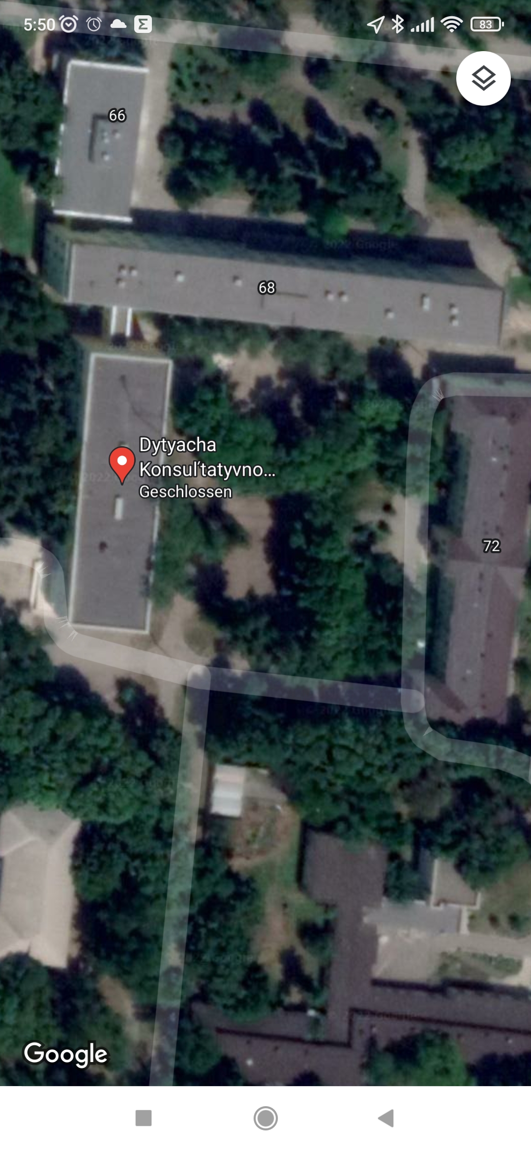 Видео снято из точки в центре приведённого Виталием участка карты. Внизу карты видно здание, оно на видео не попало (за спиной оператора), Думаю, потому что не пострадало. А ещё ниже (уже не на этом участке), родильное отделение - думаю, если оно пострадало от взрыва, его бы тоже сняли, профессионал же снимал, а не просто какой-то очевидец.