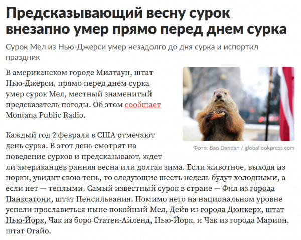 В американском городе Милтаун, штат Нью-Джерси, прямо перед днем сурка умер сурок Мел, местный знаменитый предсказатель погоды. Об этом сообщает Montana Public Radio.