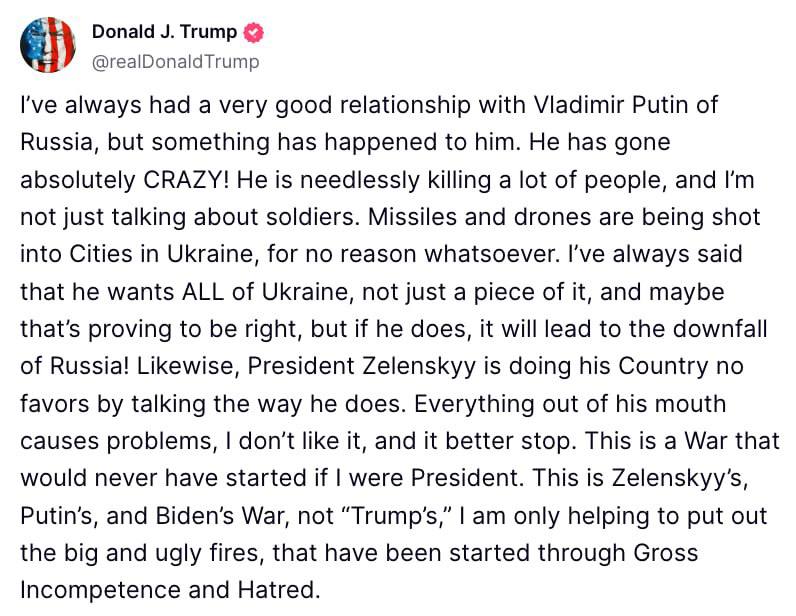 У меня всегда были очень хорошие отношения с Владимиром Путиным из России, но с ним что-то случилось. Он сошел с ума! Он без необходимости убивает много людей, и я говорю не только о солдатах. Ракеты и беспилотники стреляют по городам Украины без всякой причины. Я всегда говорил, что он хочет ВСЮ Украину, а не только ее часть, и, возможно, это так оно и окажется, но если он это сделает, это приведет к падению России! Точно так же президент Зеленский не приносит своей стране никакой пользы, когда высказывается так, как он это делает. Все, что выходит из его уст, вызывает проблемы, мне это не нравится, и это лучше прекратить. Это война, которая никогда бы не началась, если бы я был президентом. Это война Зеленского, Путина и Байдена, а не «война Трампа», я только помогаю потушить большие и уродливые пожары, которые были начаты из-за грубой некомпетентности и ненависти.