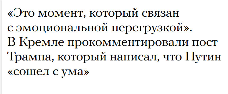Трамп давно знает Путина. Они всегда ладили. Путин называл Трампа "гением", он хороший парень. Но он запускает ракеты в города и убивает людей, и Трампу это не нравится. С этим парнем явно что-то случилось, Трамп очень удивлен. И ему это не нравится.