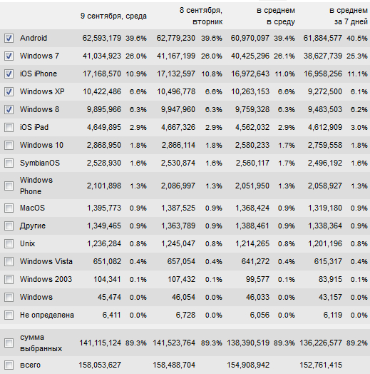 Кстати, вчерашня статистика по Рунету - используемые операционные системы (как мобильные, так и десктопные). Это насчет доли MacOS и iOS.