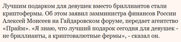 Он только забыл добавить, что вместе с криптовалютной фермой еще надо дарить мешочек бабла на оплату электричества. Также девчушке надо будет серьезно решать вопрос с эффективным охлаждением, но если кавалер такой галантный, что ферму снабдил всем необходимым и установил прямо на электростанции - ну тогда уж точно лучше, чем бриллианты.