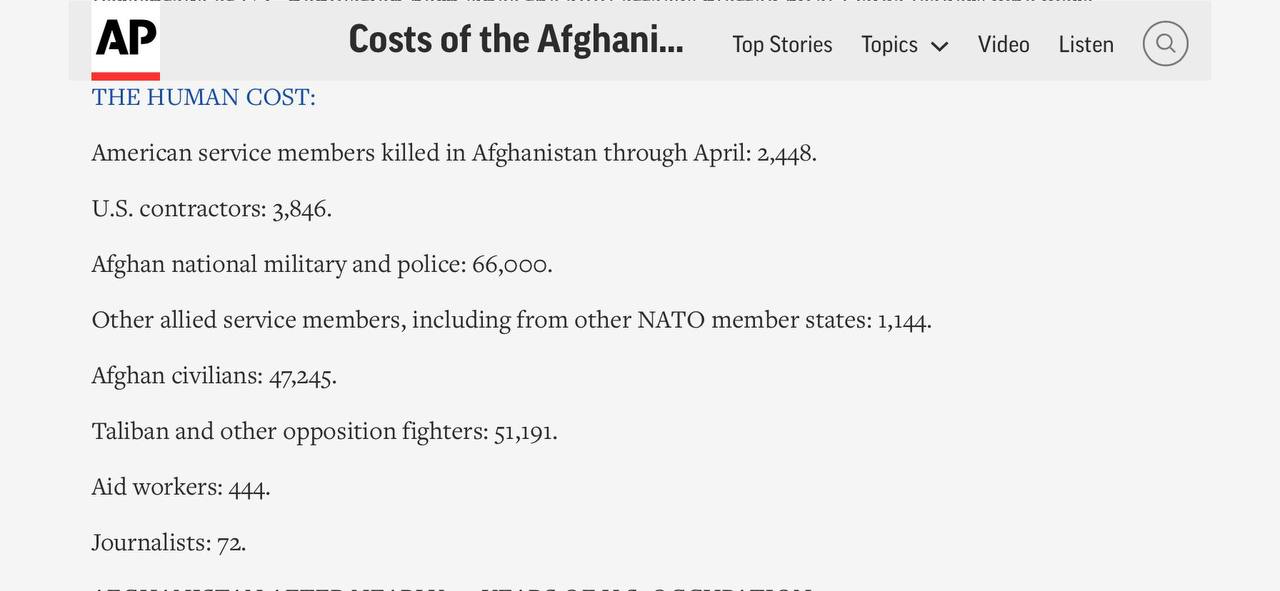 А кто их афганцев считает. Сказано же "за это дерьмо отдали свои жизни 2300 человек и более 20 тысяч человек получили ранения различной тяжести", а погибшие 241000 афганцев из них 70000 мирных (это по данным США, понятно, что когда солдаты демократии стреляют в афганцев без оружия, то это однозначно потери талибана и алькаеды) - это не " человеки".